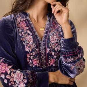 So luxurious. our velvet notch neckline popover dress is blooming with lovely embroidery on the front placket. two side seam pockets and pleating details. Viscose/silk. Dry clean. Imported. Exclusive. Sizes XS (0??). S (4??). M (8??0). L (12??4). XL (16??8). XXL (20??2). Approx. 37l.