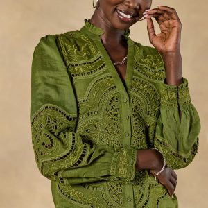 A worldly engineered print is the focus of our graceful Bingham Lace Top. with open embroidered eyelet throughout. natural shell button front and cuffs and ruffle neckline detail. Ramie. Hand wash. Imported. Exclusive. Sizes XS (0?C2). S (4?C6). M (8?C10). L (12?C14). XL (16?C18). XXL (20?C22). Approx. 24.5l.