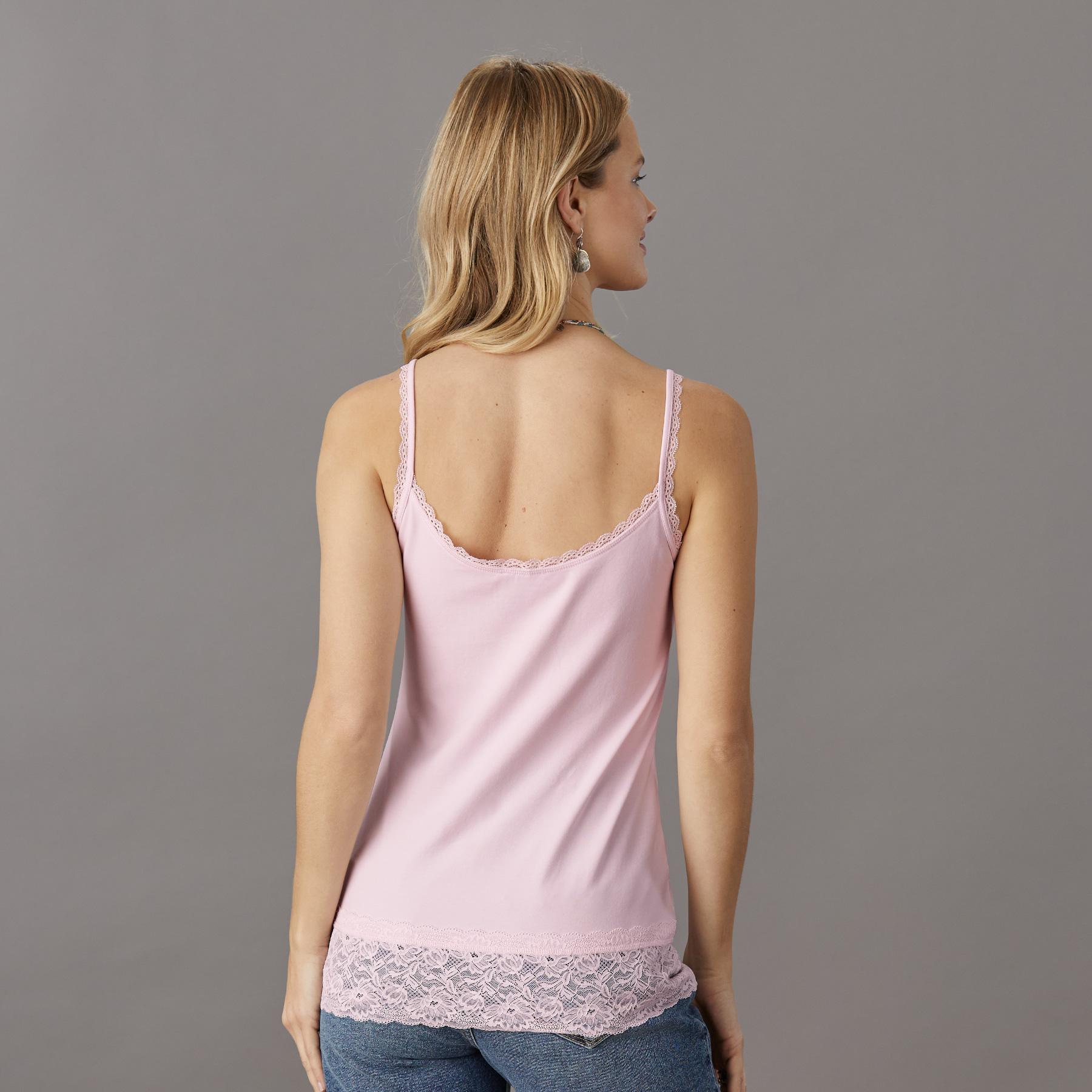 An everyday essential with the most beautiful lace at V-neck. shoulder straps and hem. Stretchy and soft. it makes the perfect underlayer. Supima cotton/spandex. Machine wash. Imported. Exclusive. Sizes XXS (00). XS (0?C2). S (4?C6). M (8?C10). L (12?C14). XL (16?C18). Approx. 24l.