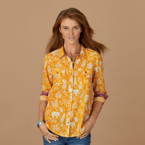 Cheerful floral print on our soft top with patch pockets. back yoke and button cuffs. Cotton. Machine wash. Imported. Exclusive. Sizes XXS (00). XS (0-2). S (4-6). M (8-10). L (12-14). XL (16-18). Approx. 24.5l.