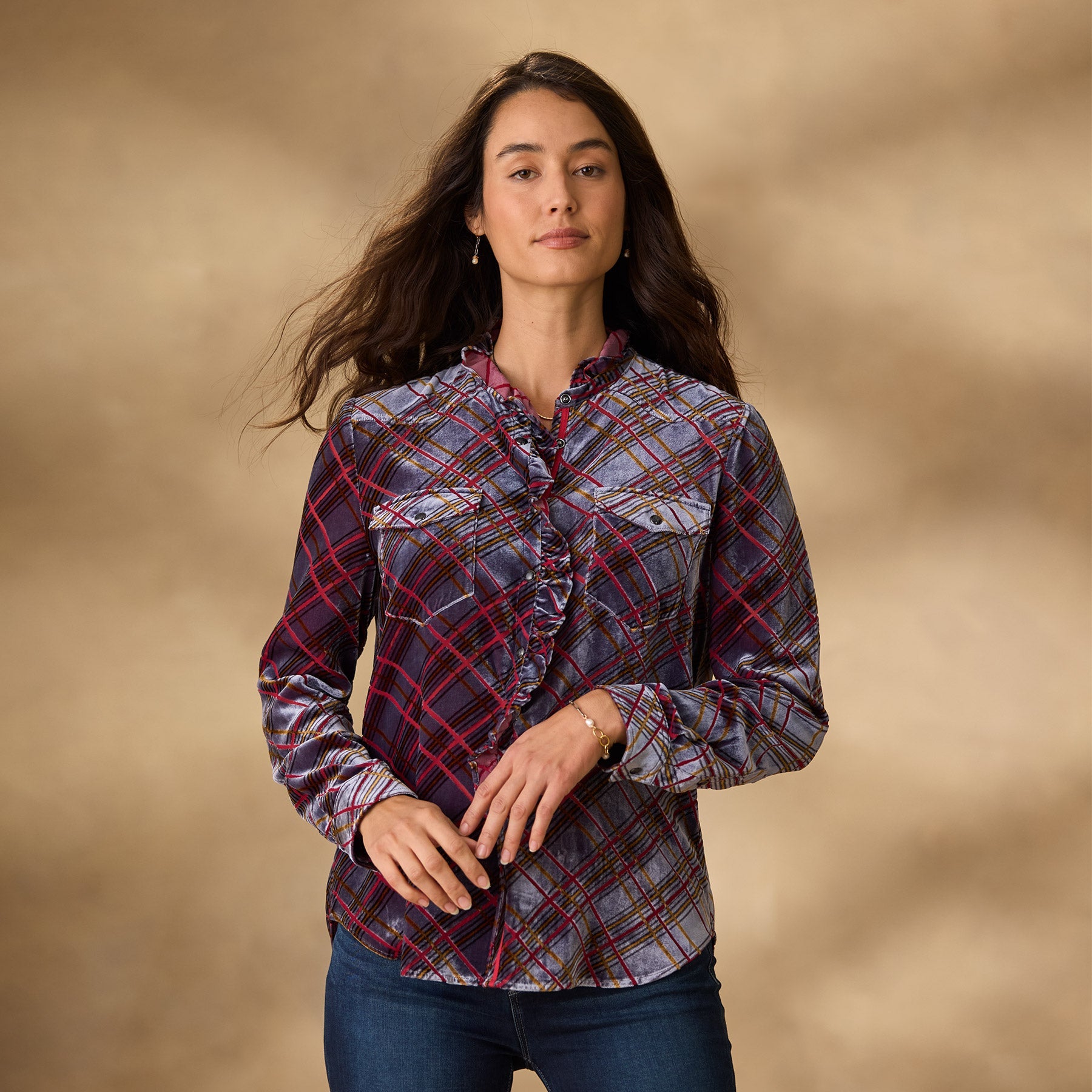 Gretel Plaid Velvet Shirt. Petite