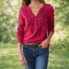 Our super textural top can be dressed up or down and is a great layering piece as well. An eyelet patchwork with ladder lace inserts. ruffle neckline and sleeves and a sophisticated keyhole shell button at back. Camisole included. Cotton. Machine wash. Imported. Exclusive. Sizes XS (0-2). S (4-6). M (8-10). L (12-14). XL (16-18). XXL (20-22). Approx. 25l.