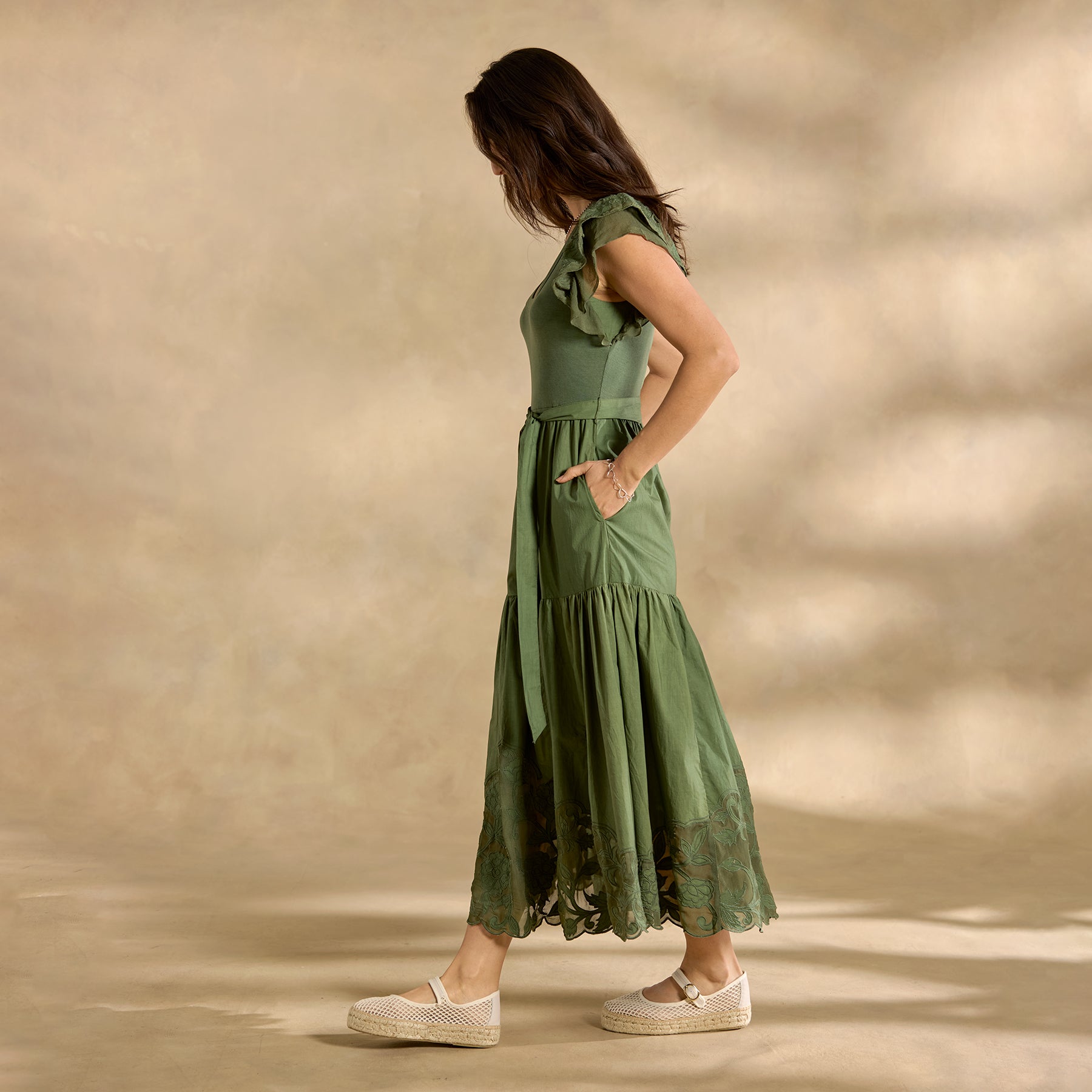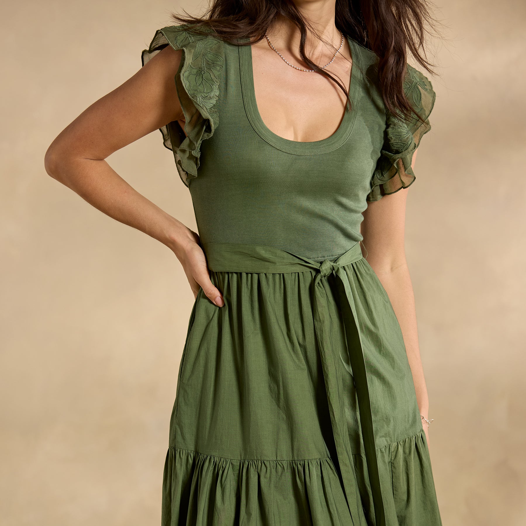 The intricate tonal detail that defines our mixed-media Madera Dress demands a closer look! With a rib-knit bodice. poplin skirt and delicate chiffon cutout details throughout—plus ruffled sleeves. scoop neck. elastic waist and lined skirt. Cotton. Machine wash. Imported. Exclusive. Sizes XXS (00). XS (0–2). S (4–6). M (8–10). L (12–14). XL (16–18). Approx. 46l.