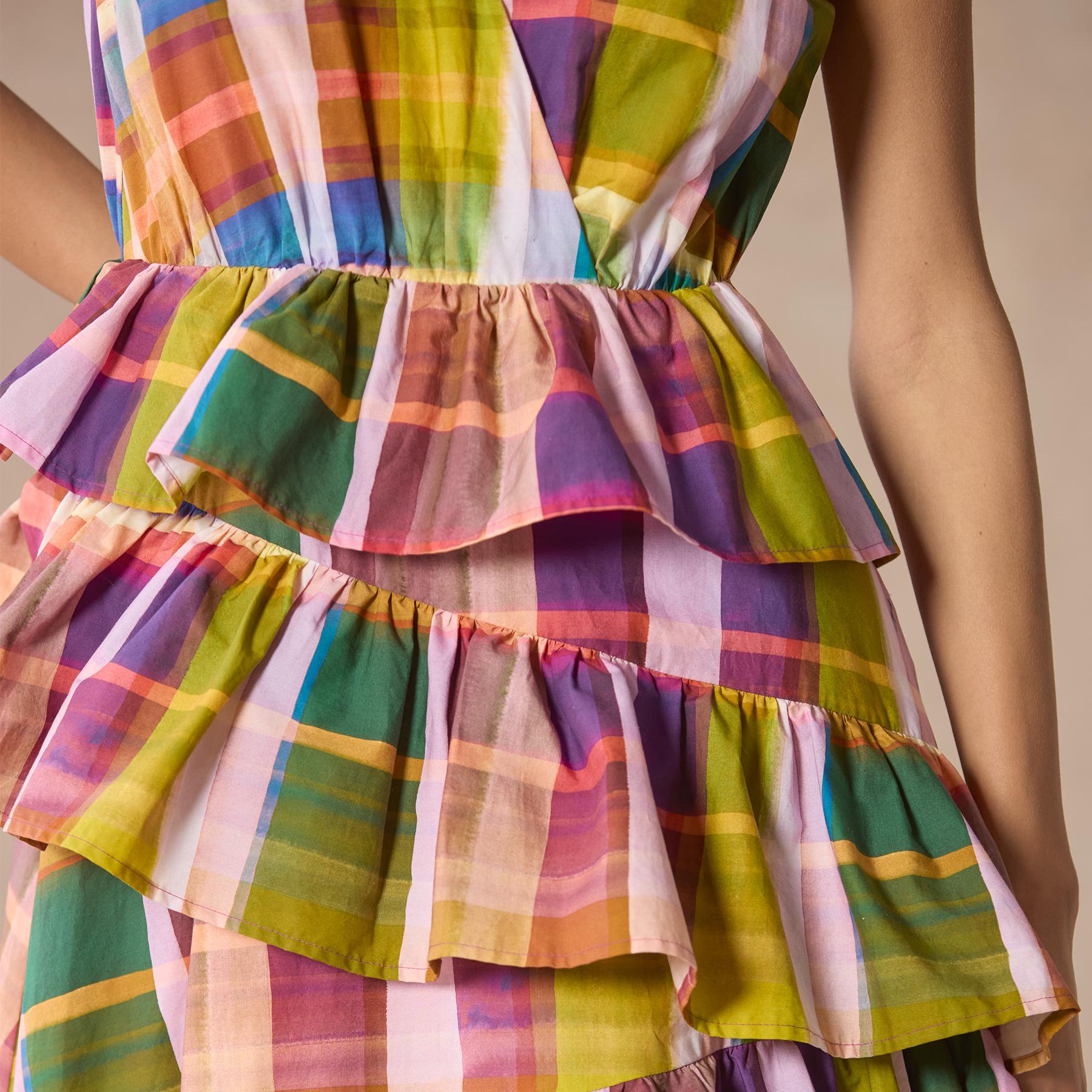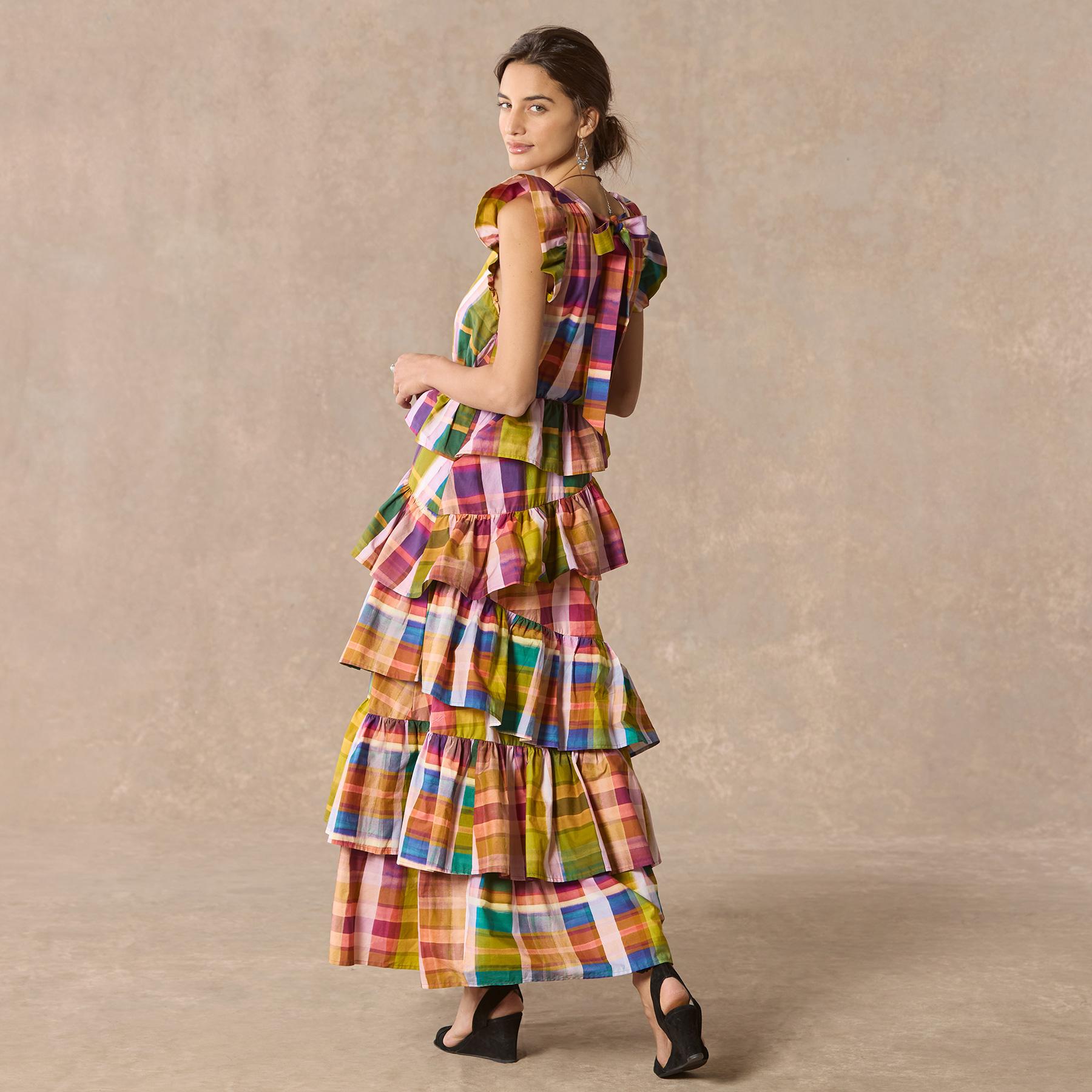 A bold madras plaid and asymmetrical. ruffled tiers make for a real statement piece. Ruffled cap sleeve. back tie at neck. Cotton. Dry clean. Imported. Sizes 2?C16. Approx. 55l.