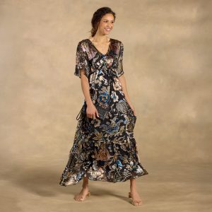 This stunning. iridescent. burnout velvet dress features a v-neck. short sleeves and tie at the waist. Slip included. Viscose/silk/polyester/spandex. Dry clean. Imported. Exclusive. Sizes XS (0?C2). S (4?C6). M (8?C10). L (12?C14). XL (16?C18). XXL (20?C22).