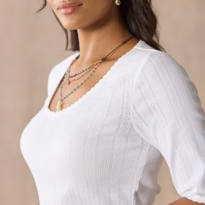 Your new everyday essential elbow length tee is a must have for layering or to wear alone with pretty pointelle fabric and an easy scoop neckline featuring scalloped lace. Cotton. Machine wash. Imported. Exclusive. Sizes XXS (00). XS (0??). S (4??). M (8??0). L (12??4). XL (16??8). Approx. 23l.