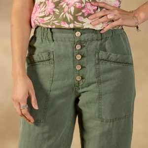 Our relaxed-fit Rivera Pants feature a classic straight-leg fit with a flat-front waist and comfy elastic back??plus pretty ladder lace on the patch pockets. Cotton/linen. Machine wash. Imported. Exclusive. Sizes 2?C16. 28 inseam.