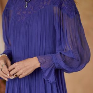 A vintage silhouette is updated in vibrant crinkle chiffon with embroidered mesh neckline. asymmetrical ruffle and elastic ruffle sleeves. Fully lined. keyhole button back. Viscose. Hand wash. Imported. Sizes XS (0-2). S (4-6). M (8-10). L (12-14). XL (16-18). XXL (20-22). Approx. 48l.