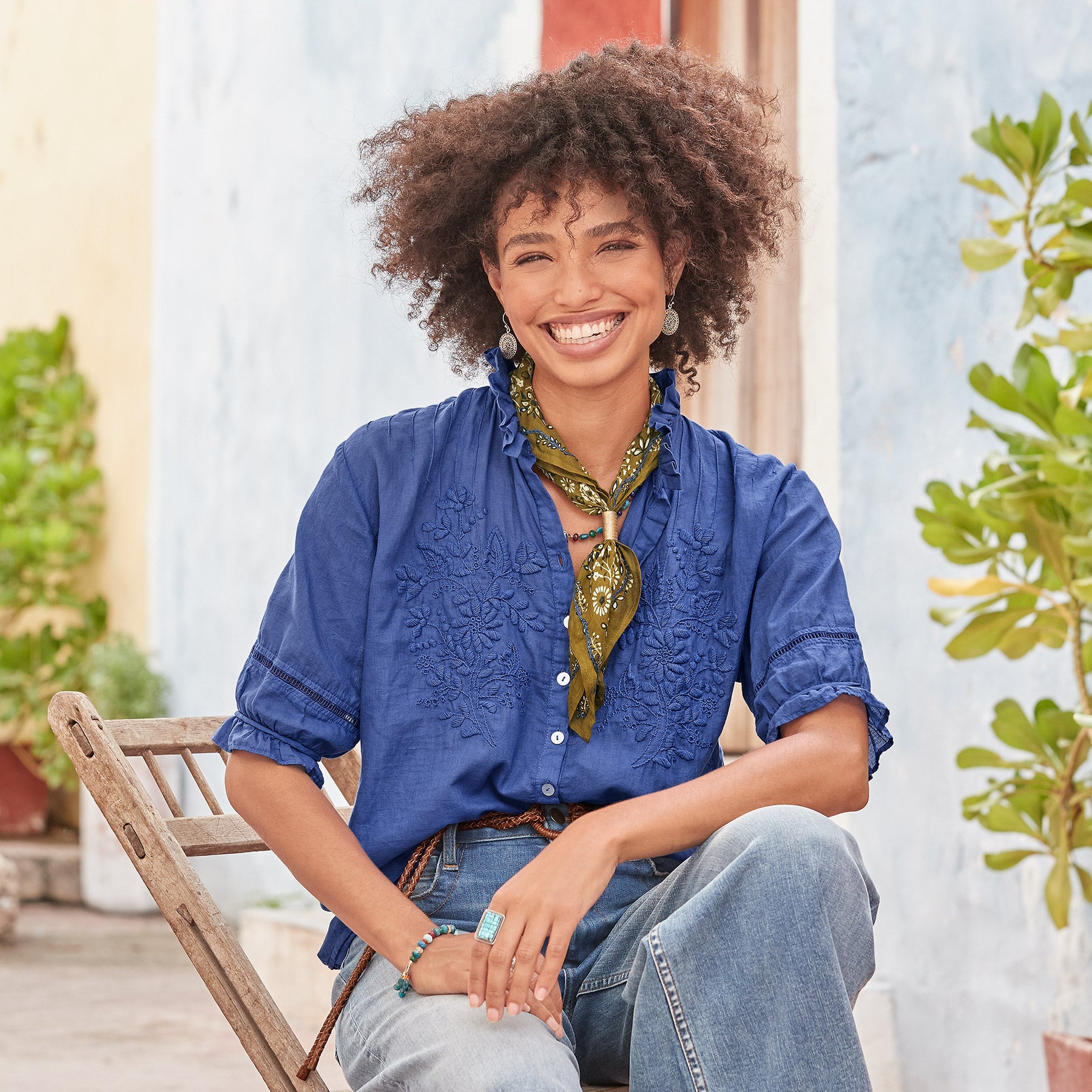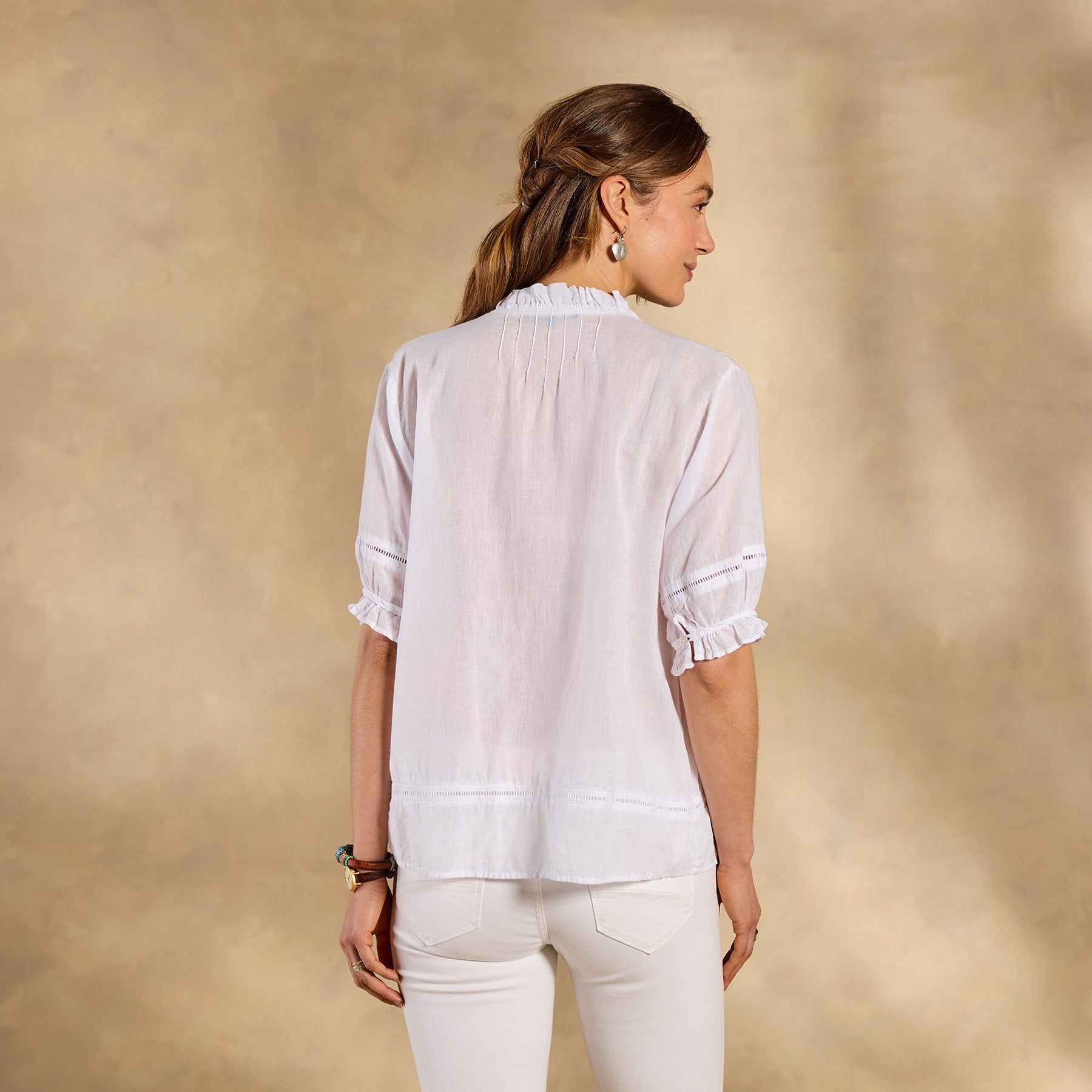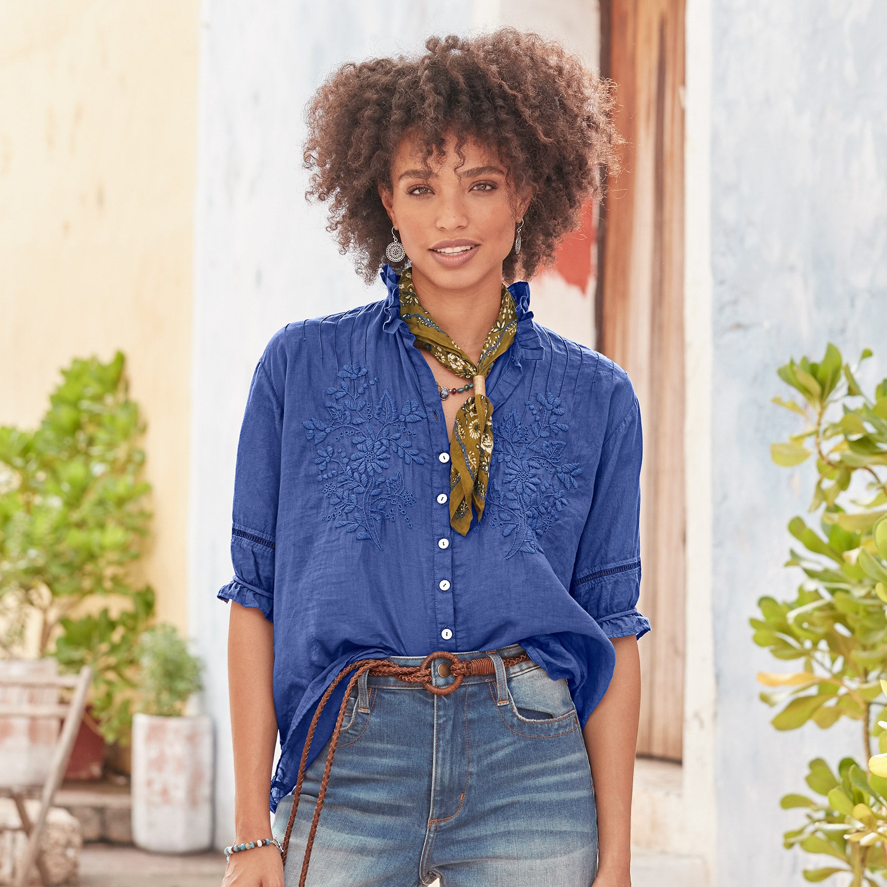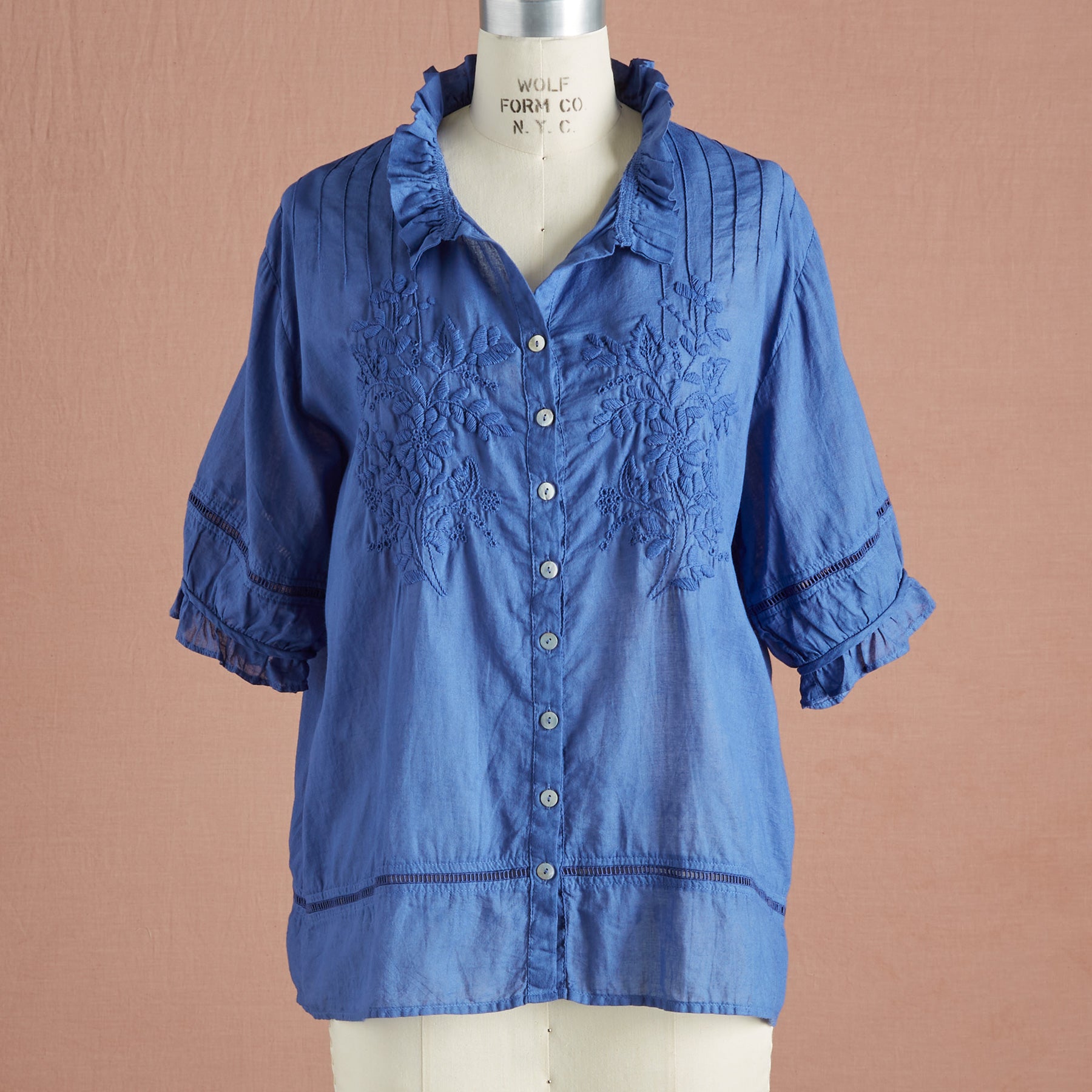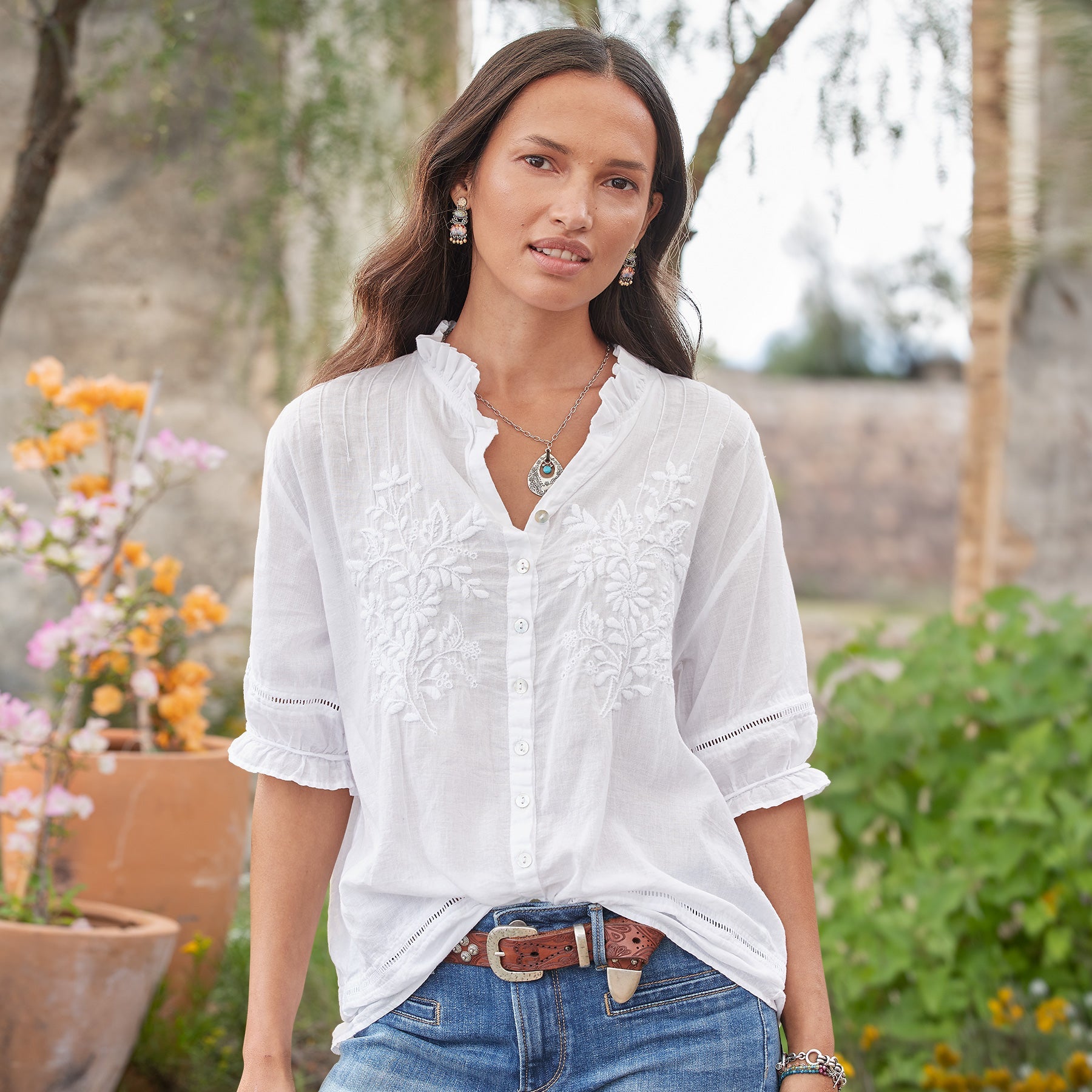 Detailed. hand embroidered florals grace our romantic top with ruffles at the neckline and sleeves. ladder lace and pleating detail. Button cuff. Cotton. Hand wash. Imported. Sizes XS (0-2). S (4-6). M (8-10). L (12-14). XL (16-18). Approx. 26l.