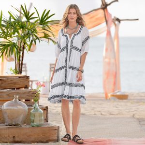 Soft and flowy. cotton gauze in a lovely tiered design imbues this dress with a brilliant. laid back vibe. embellished with banded. button cuffs. and geometric embroidery along each tier and center placket. Unlined. Cotton. Hand wash. Imported. Exclusive. Sizes XS (0 to 2). S (4 to 6). M (8 to 10). L (12 to 14). XL (16 to 18). XXL (20 to 22). Approx. 40-1/2L.
