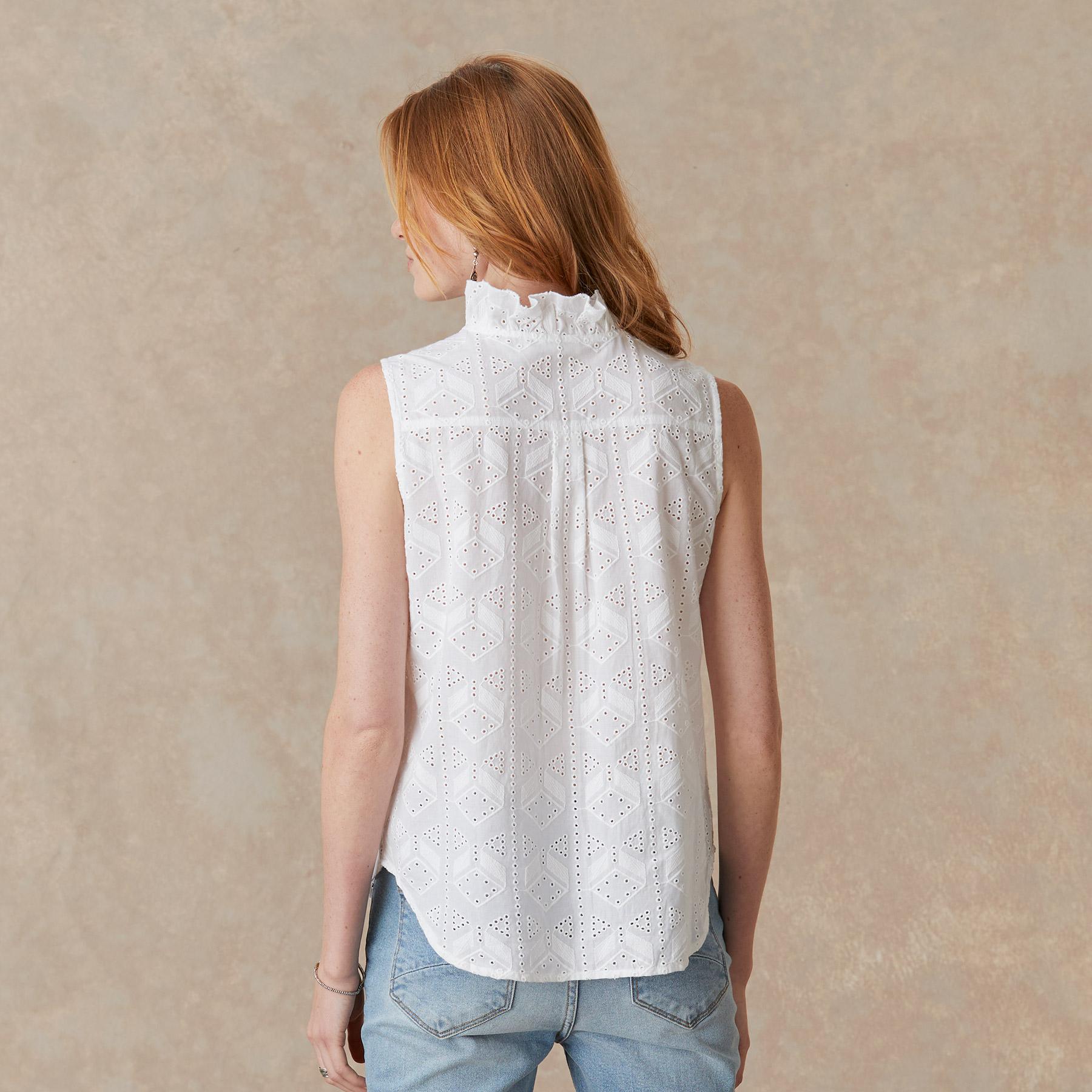 Subtle ruffles adorn the collar and hidden-button placket of our sleeveless. classic-fit top. embellished with eyelet details and rounded hem. Cotton. Machine wash. Imported. Sundance exclusive. Sizes XS (4). S (6). M (8–10). L (12). XL (14). XXL (16). Approx. 25.25l.