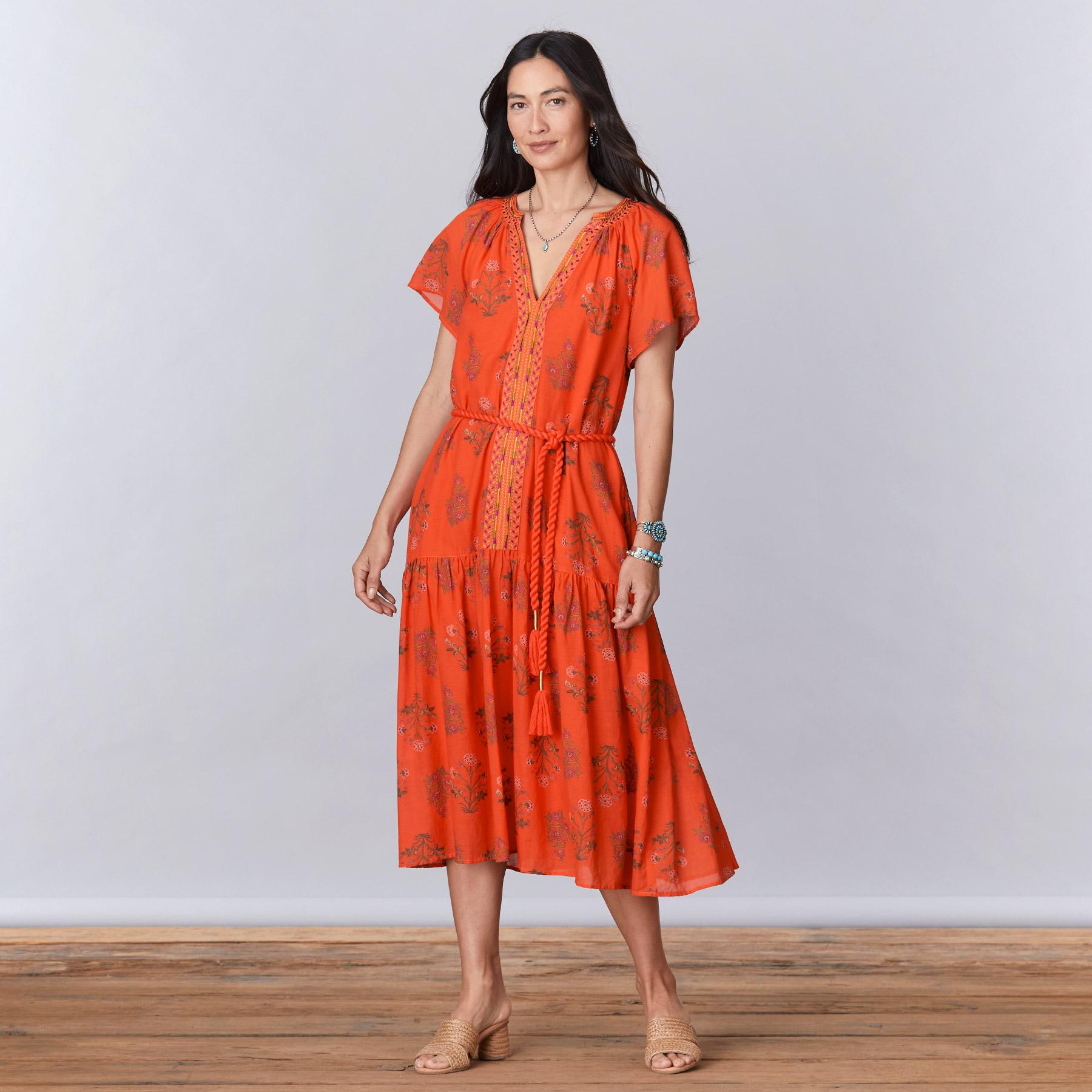 An ode to summer. our easy. flowing. floral print dress with geometric embroidery detail at neckline and placket. With one tier. flutter sleeves. notch neckline. side seam pockets and a removable ring loop rope belt. Lined. Cotton/viscose. Machine wash. Imported. Exclusive. Sizes XS (0?C2). S (4?C6). M (8?C10). L (12?C14). XL (16?C18). XXL (20?C22). Approx. 48l.