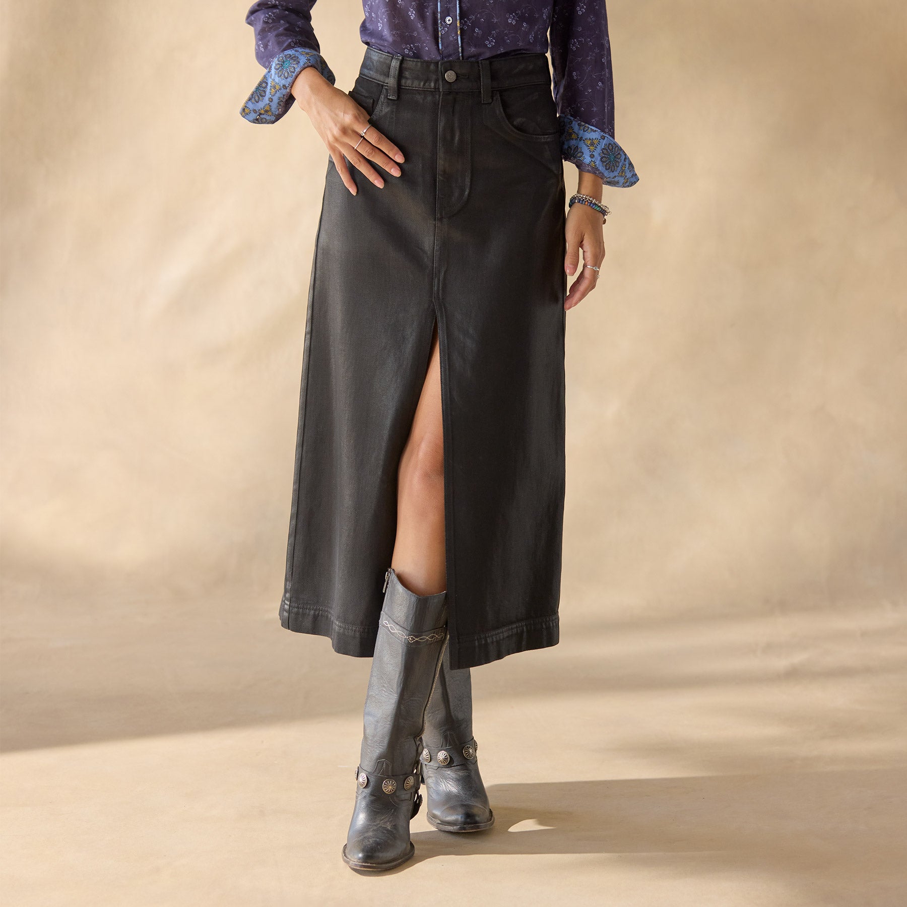 Our stylish oh so easy to wear coated denim skirt takes a classic look and adds a special touch with five pockets. button and zip fly closure and a sophisticated center front slit. Cotton/lycra. Machine wash. Imported. Exclusive. Sizes 24–32. Approx. 31l.